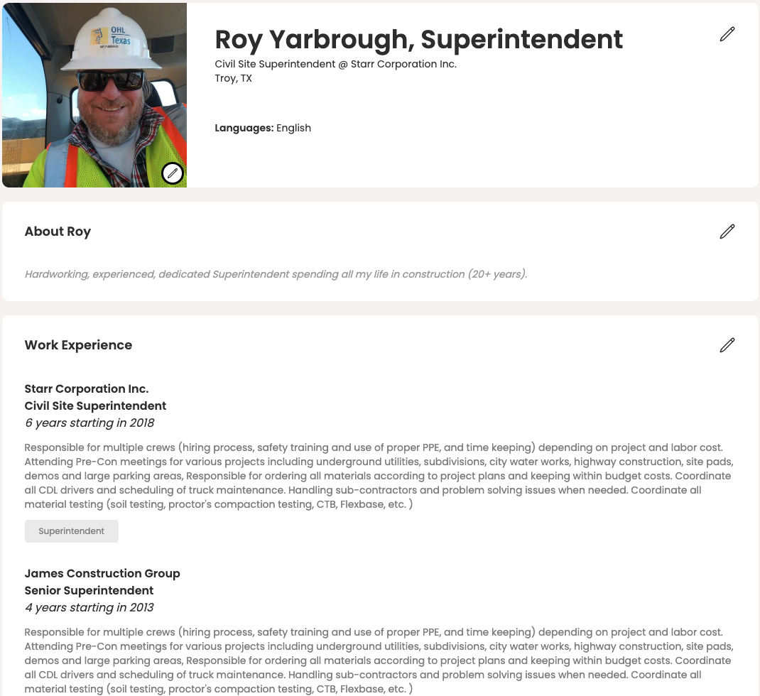 That’s why we always recommend taking the time to fill out your profile thoroughly. List all of your past construction work experience. Include every certification you have. Mention the equipment you’re trained on. Share whether you’re open to travel for per diem or relocate for the right opportunity. The more you include, the easier it is for recruiters to know you're the right fit and the faster you get to work.
